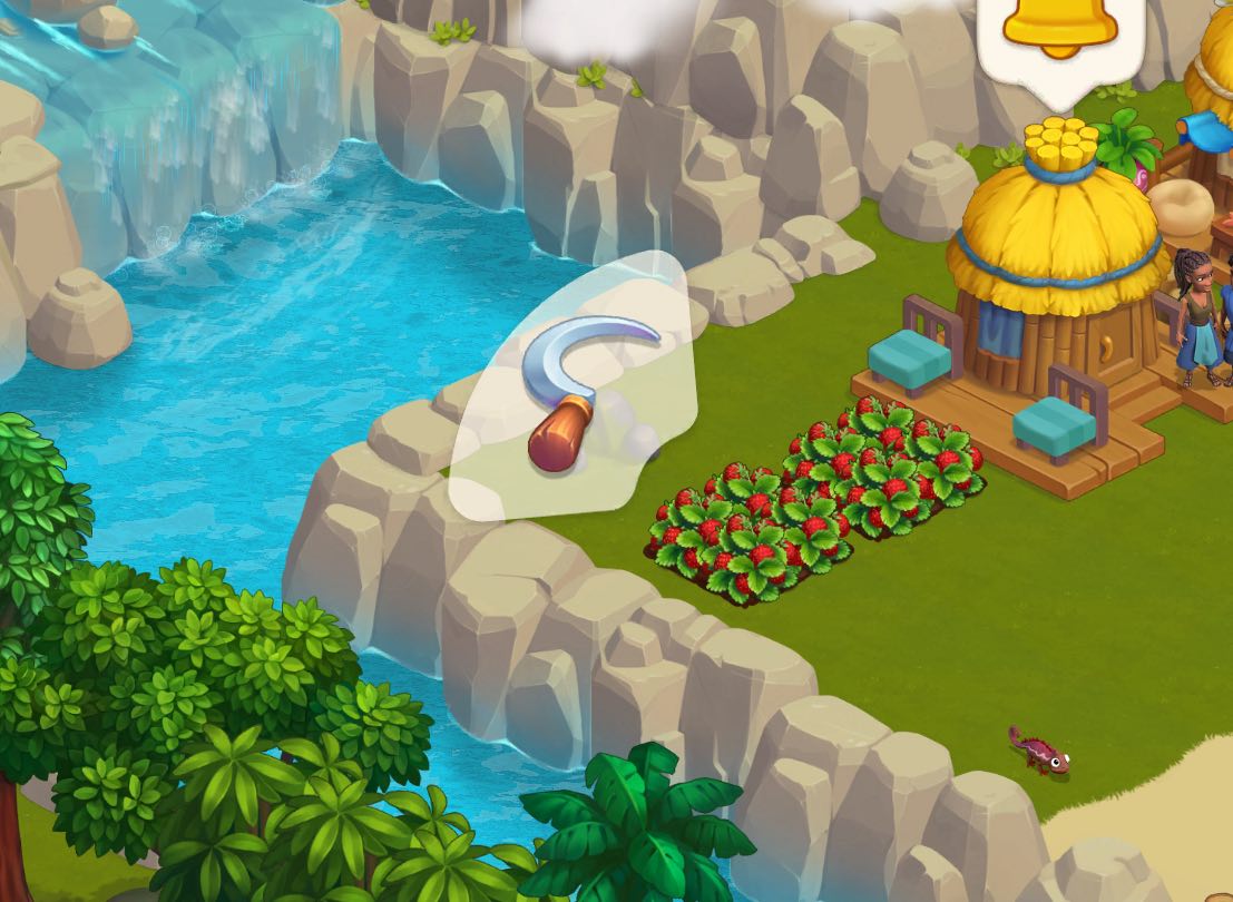 Sobald die Früchte deiner Arbeit bereit sind, tippe sie an – dann erscheint ein Korb oder eine Sichel. Ziehe sie über die Bäume oder Beete, um die Ressourcen einzusammeln.