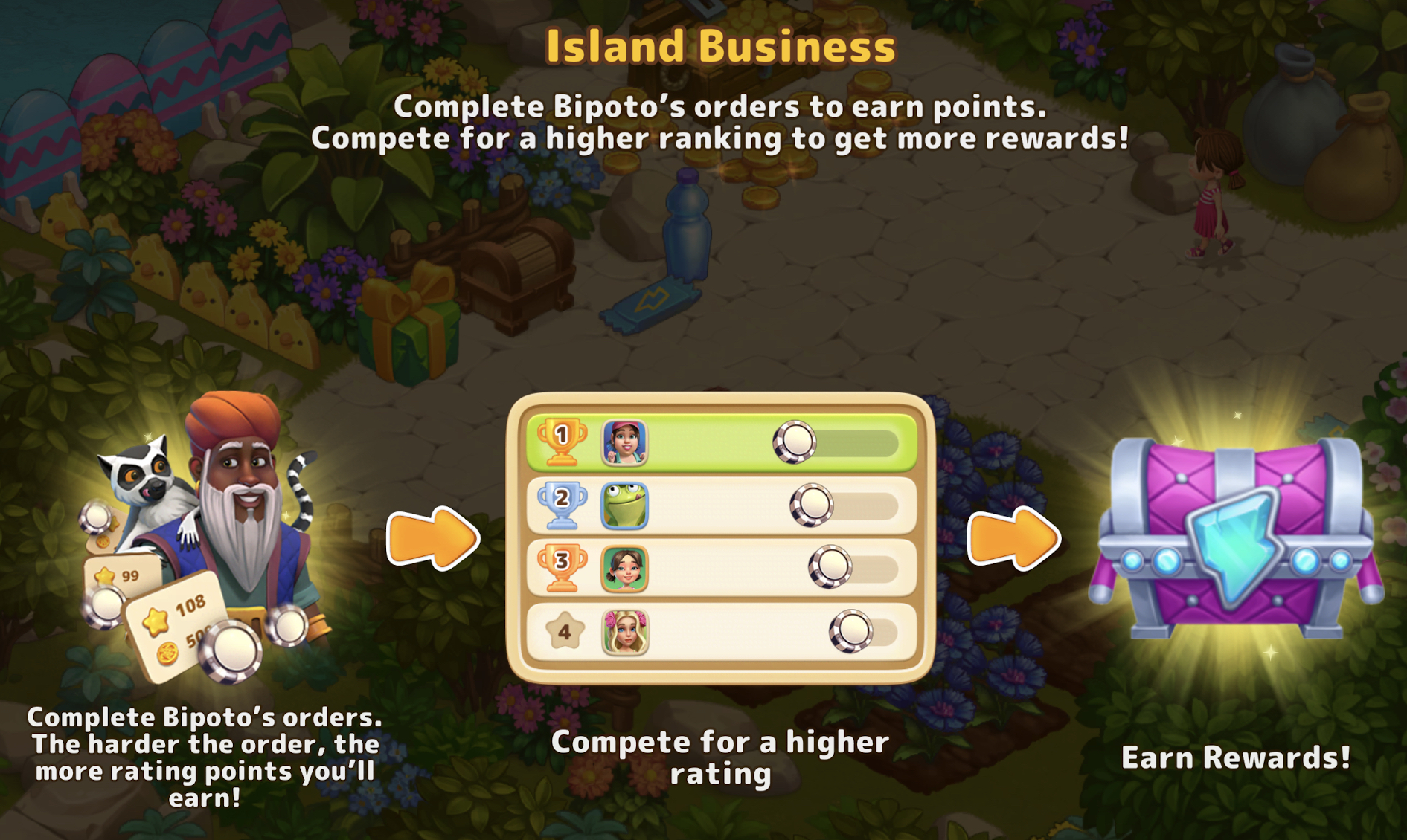 Bereit zu beweisen, dass Ihr Inselgeschäft das beste ist? Es ist Zeit, am Unternehmerwettbewerb mit Bipoto teilzunehmen! Erfüllen Sie Aufträge, sammeln Sie Punkte und messen Sie sich mit anderen Spielern um tolle Belohnungen.