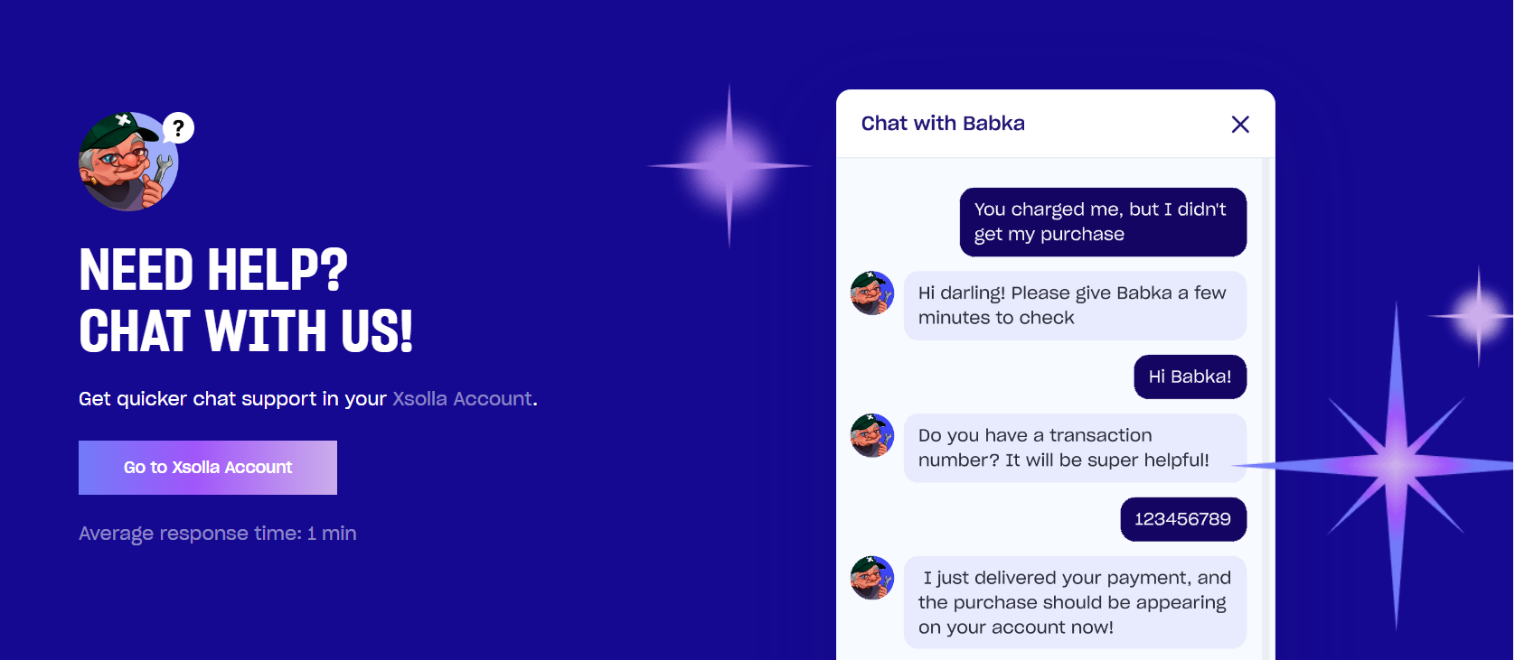 Hier kun je een Xsolla-account aanmaken of inloggen om sneller de benodigde informatie van het ondersteuningsteam te krijgen. Houd er rekening mee dat de gemiddelde reactietijd 1 minuut is!