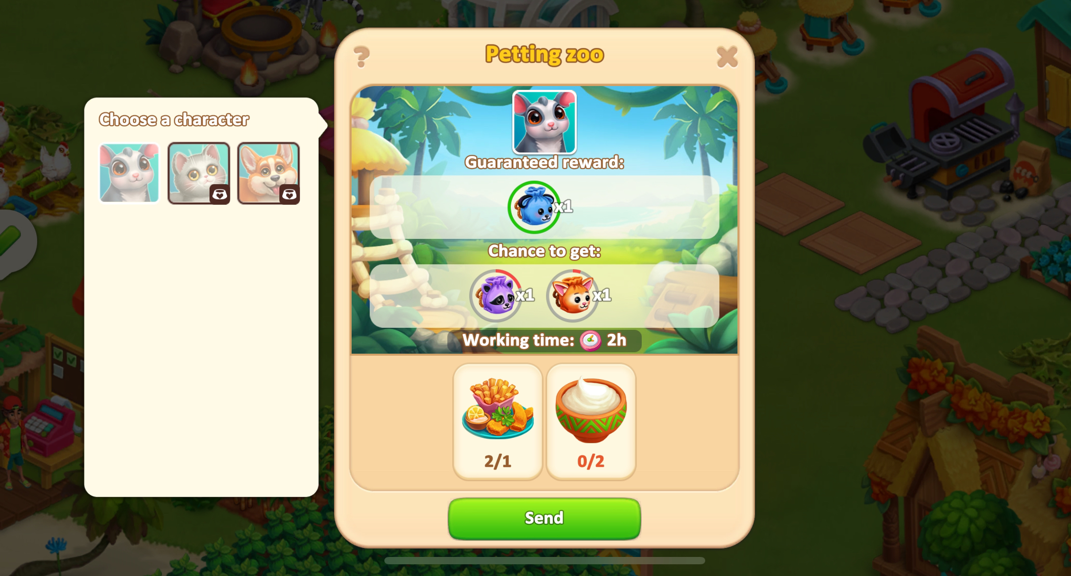Depois, abra o zoológico interativo e escolha o animal de estimação. Mas observe que você só pode escolher um animal quando ele estiver alimentado! Aqui você pode ver os recursos necessários para iniciar o processo e os souvenires que você pode obter.