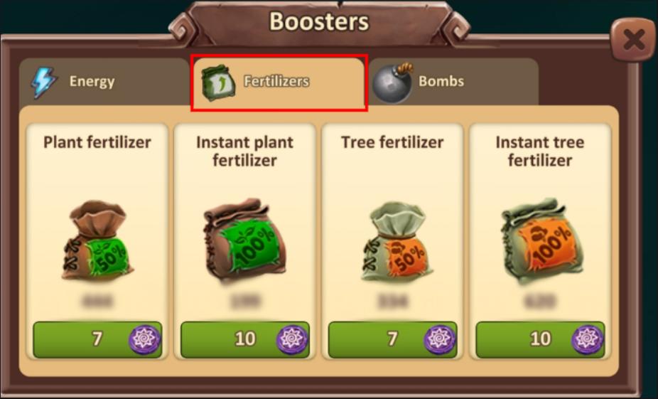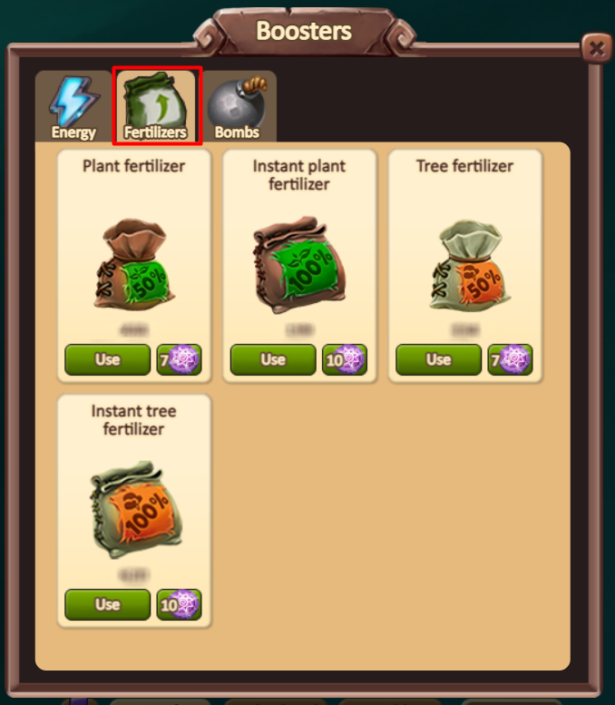 Купівля за допомогою Сонячних рун: Ви можете придбати 50% добрив за допомогою Сонячних рун у меню «Домогосподарство» або «Бустери».
